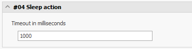 Die Sleep action unterbricht die Verarbeitung des Import-Jobs um die Anzahl von Millisekunden. Diese Aktion kann verwendet werden, um nach Dienstneustarts etc. die Ausführung zu verzögern.